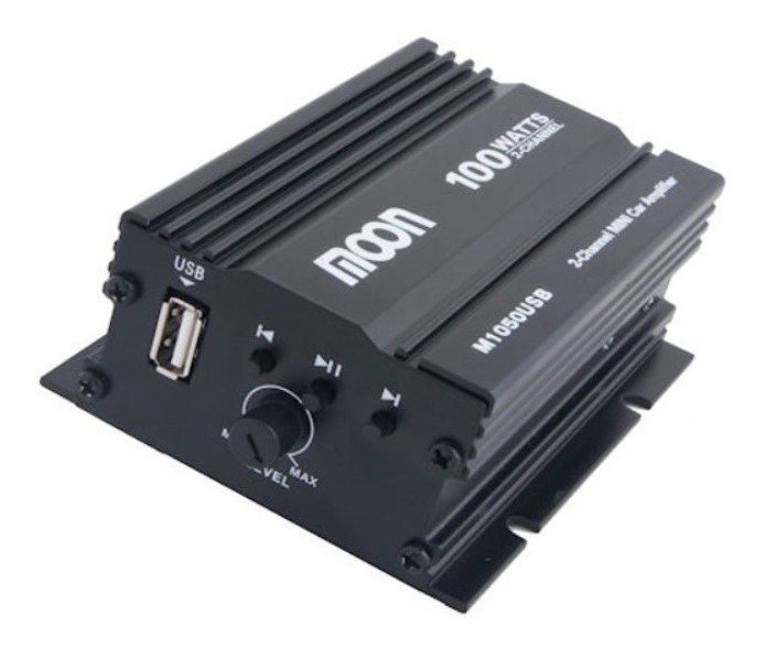 Amplificador mini con puerto USB. De 12 Vol. Potencia RMS (4 ohms): 100W . S/N: 85dB. Control de nivel de ganancia. Salida RCA. Respuesta de frecuencia: 20Hz-20KHz. De 4″ de largo x 3″ de ancho x 1.5″ de altura.