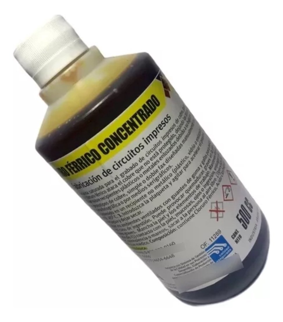 Solución acuosa saturada para el grabado de circuitos impresos de cobre, para placas de epoxi o fenólicas. Debe utilizarse sobre recipientes plásticos o enlosados debido a su bajo pH.