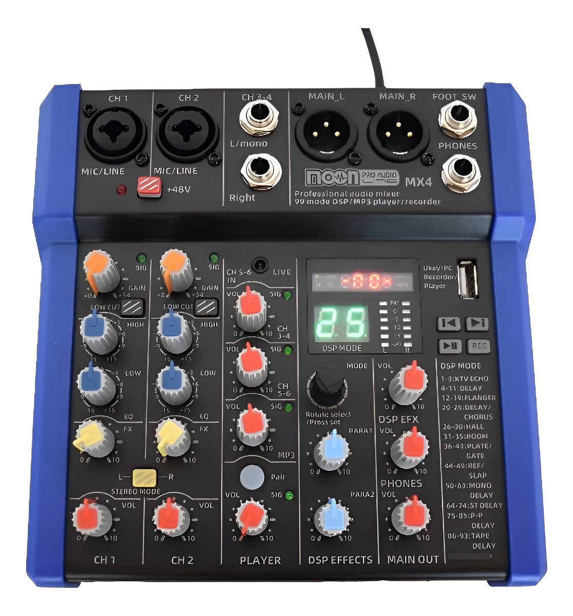 La Moon MX4 es una consola compacta y versátil, ideal para DJs, estudios, bandas y sonidistas que buscan calidad y practicidad. Cuenta con múltiples funciones para mezclar y crear con total libertad, incluyendo efectos DSP, reproductor MP3 inalámbrico y conexión USB.