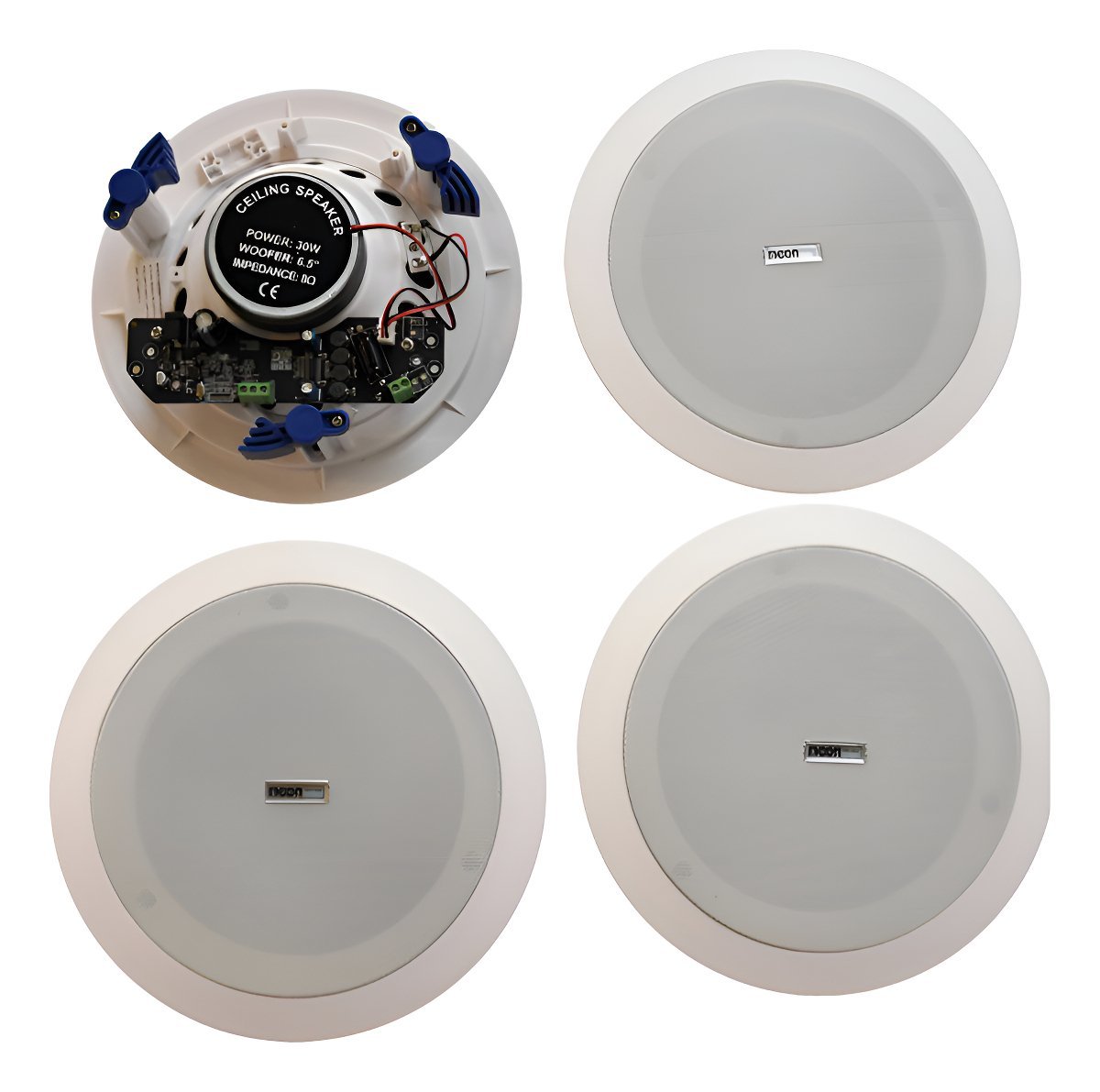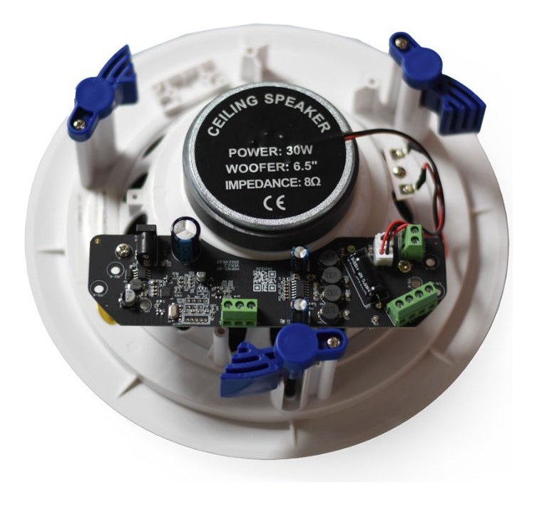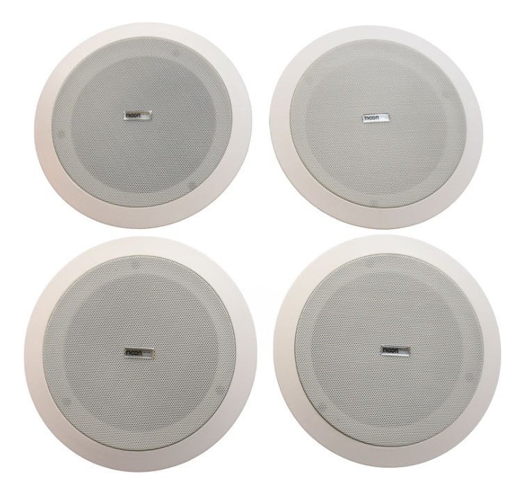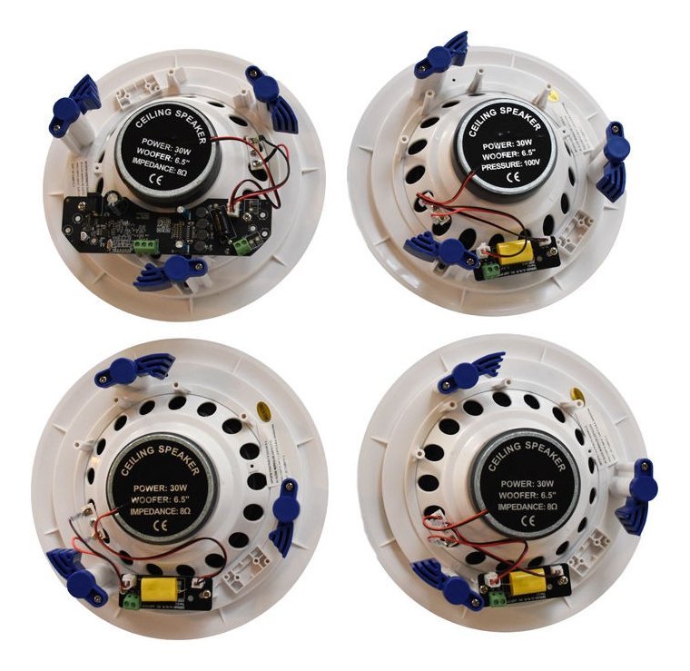 Parlante de techo de 6.5″. Potencia: 30Wx4. Frecuencia: 70-20KHz. SPL (@1W/m): 90dB. En cada set: 1 parlante activo + 3 pasivo. Color blanco. Con fuente de 15V DC. Incluye 3 x 5metros de cable para instalacion