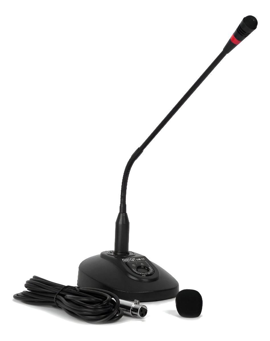 Micrófono unidireccional (condensador) de conferencia (cuello de ganso) negro. incluye base con botón de encendido con indicador led, cable de 6 metros canon/plug, alimentación phantom o con dos pilas AA (no incluidas) y antipop