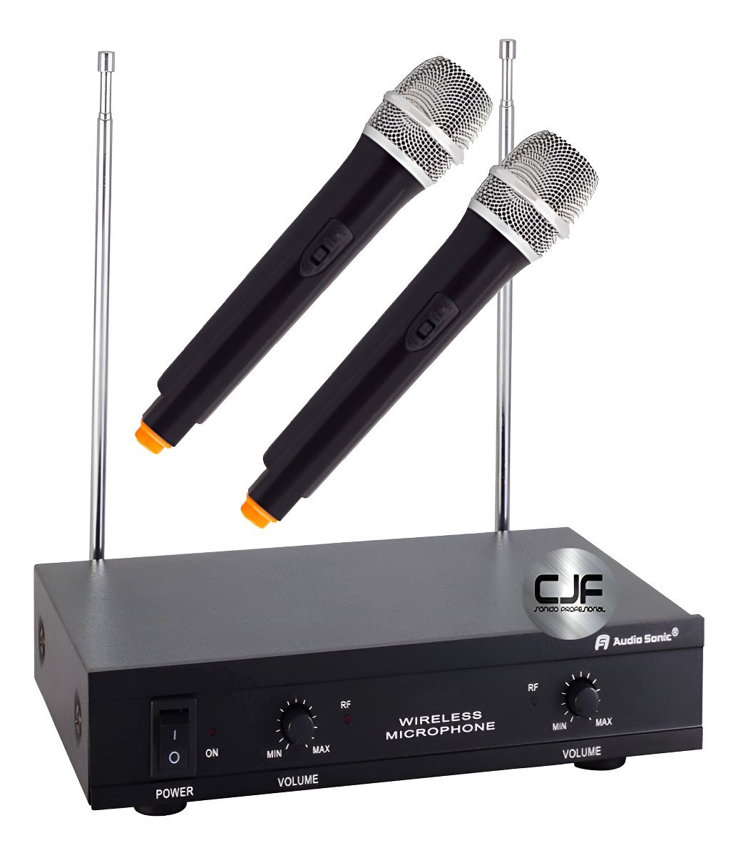 AUDIO SONIC Micrófono inalámbrico VHF 2 canales de mano Receptor doble Frec. trabajo: 200 – 260 Mhz (en 5 canales dist.) Rta de frecuencia: 80 Hz – 12 kHz (+- 3 dB) Relación señal/ruido > 100 dBA Salida A, B y Mix A+B (doble canon/ 6.5 mm) Alimentación 12 VCC, 1000 mA (incluye fuente) Transmisores de mano Alcance efectivo: 30 mt, máx.50 mt Frec. de trabajo: Idem receptor Cápsula dinámica de excelente calidad Estabilidad: +- 0,005 % (controlada por cuarzo) Alimentación: Pilas AA x 2 (no incluidas) Potencia RF: 30 mW