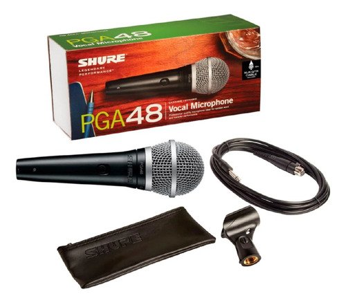 El PGA48 es un micrófono vocal de calidad profesional con un diseño industrial moderno, acabado metálico de color negro y rejilla esférica plateada. Es ideal para la voz hablada y los karaokes, y cuenta con un interruptor de encendido/apagado, adaptador giratorio y funda con cremallera. Incluye un cable con conector XLR a QTR (jack de 6,3 mm) de 4,57 m.