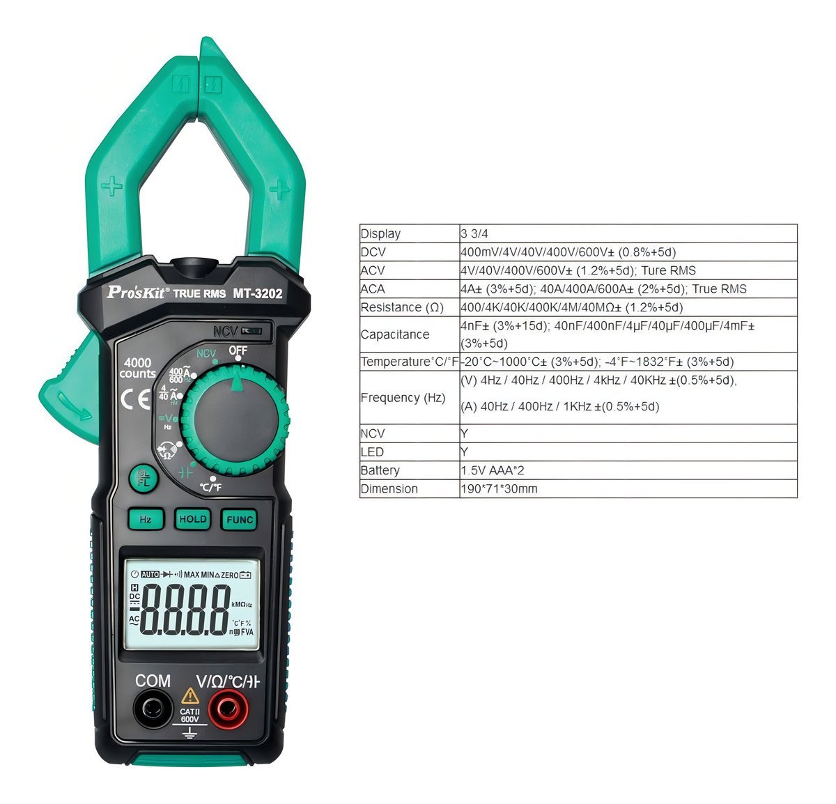 – ACV: 4V / 40V / 400V / 600V ±(1.2%+5d) True RMS