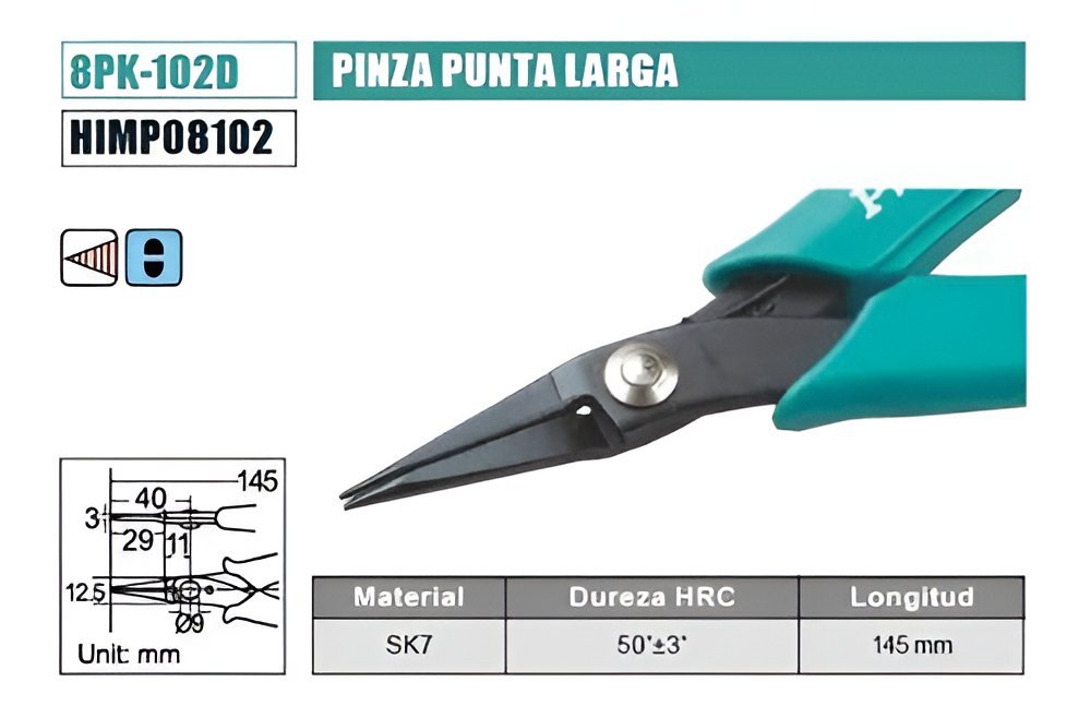 La pinza está hecha de SK7, un material de alta calidad conocido por su resistencia y durabilidad. Esto asegura que la pinza pueda soportar incluso los trabajos más exigentes y seguir funcionando al máximo rendimiento. Además, el mango de la pinza está hecho de PVC antideslizante. Esto no solo proporciona un agarre cómodo, sino que también garantiza que la pinza no se deslice de la mano durante el uso, lo que aumenta la seguridad y la precisión del trabajo.