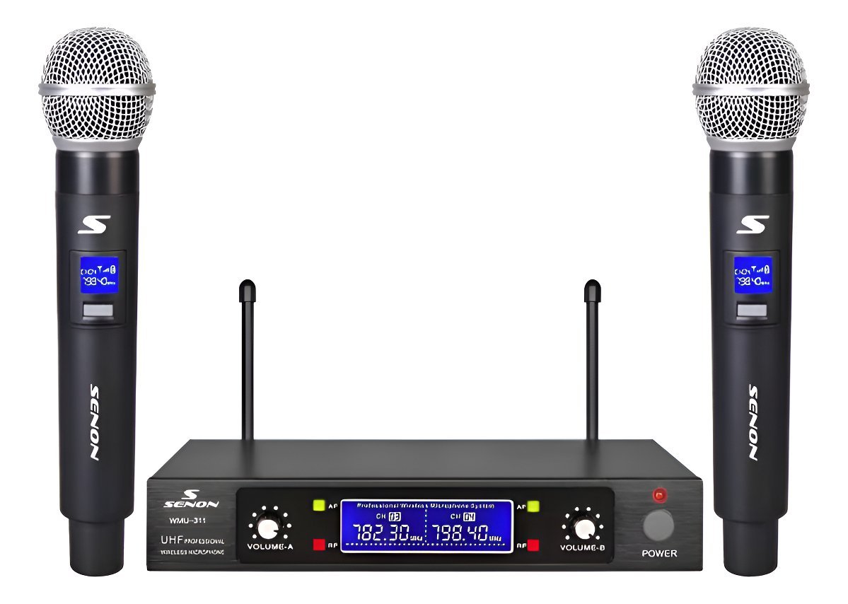Sistema de recepción inalámbrico. De UHF. Doble. Con dos micrófonos de mano. Base con gabinete metálico. Relación señal/ruido: >100dB. Frecuencia de trabajo: 750-800Mhz. Respuesta de frecuencia: 40Hz-16KHz. Incluye valija plástica, cable plug-plug.