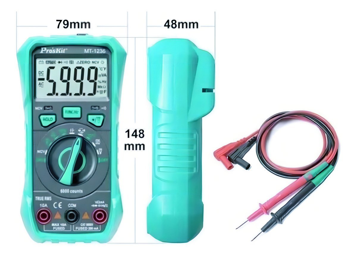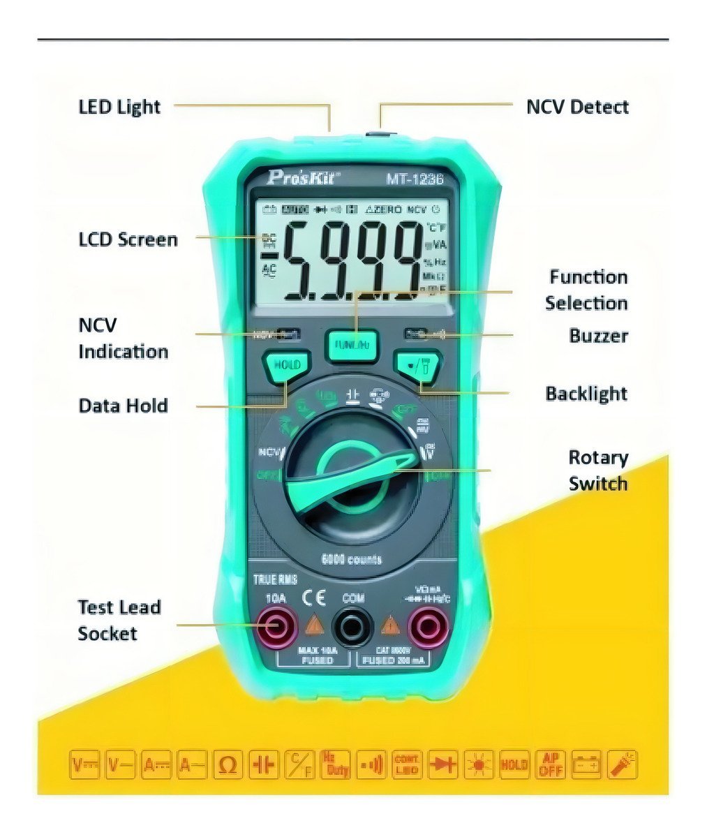 Este nuevo multímetro multifunción presenta alta precisión y alto rendimiento permitiéndote medir voltaje CC / CA, corriente CA / CC, resistencia, capacitancia, frecuencia y ciclo de trabajo, etc. También viene con detección NCV (voltaje sin contacto), medición de temperatura, medición de continuidad, linterna LED y más!